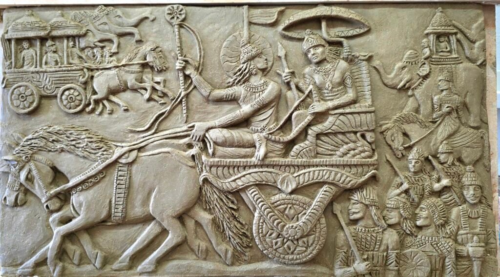 My most recent art piece is of my favourite moment in the BG – and the most human. It is the moment when Arjuna realizes what is entailed and expected of him, his moment of terrible confusion and doubt. And Krishna is leading him on with such fierce and uncompromising clarity… I attached a pic. It is being fired at the moment, and the next stage will be glazing it.
